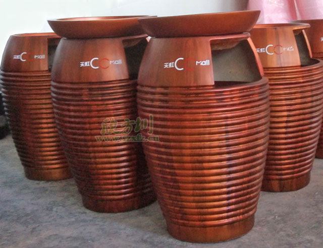 天虹商場定制的A90玻璃鋼花盆式垃圾桶外形似壇子,由花盆頂蓋、桶蓋、桶身三部分組成,可套垃圾袋方便垃圾收集清理,產(chǎn)品規(guī)格為545*1000mm(大),450*780mm(?。淮笠恍?個為一組,可組合擺放效果更佳。表面做仿舊工藝,桶底座配重可防止一碰就倒,桶身絲印天虹LOGO,頂蓋做花盆設(shè)計,既可保持天虹商場環(huán)境衛(wèi)生,又能裝土種植鮮花美化天虹,這是一款實用多功能玻璃鋼垃圾桶。