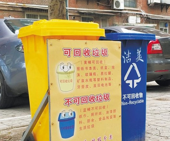 小區(qū)每棟居民樓前都擺放了黃色和藍(lán)色兩種顏色的塑料戶(hù)外垃圾桶,其中黃色垃圾桶前還用三角鐵架固定了提示牌,上面有清晰詳盡的使用說(shuō)明,標(biāo)明黃桶收集“可回收垃圾”,包括報(bào)紙書(shū)本類(lèi)、紙盒、泡沫、玻璃瓶、易拉罐、礦泉水瓶等塑料制品以及牙膏皮、廢舊電池等;藍(lán)桶收集“不可回收垃圾”,包括紙巾、衛(wèi)生紙、油漆顏料、廚余、食品殘留等生活垃圾。