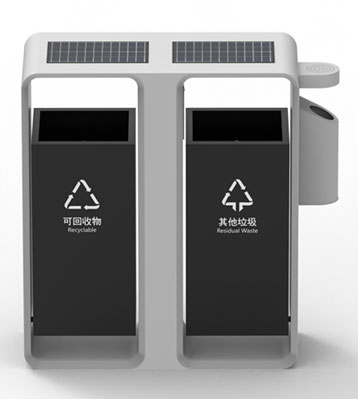 智慧城市戶外滅蚊燈垃圾桶側(cè)面煙灰柱滅煙及煙蒂收集使用定制設(shè)計,絲印新版可回收物、其他垃圾分類標識,前后搖擺分類桶桶身取出內(nèi)桶清運垃圾。底座預(yù)留孔位與地面固定,安全防傾倒。